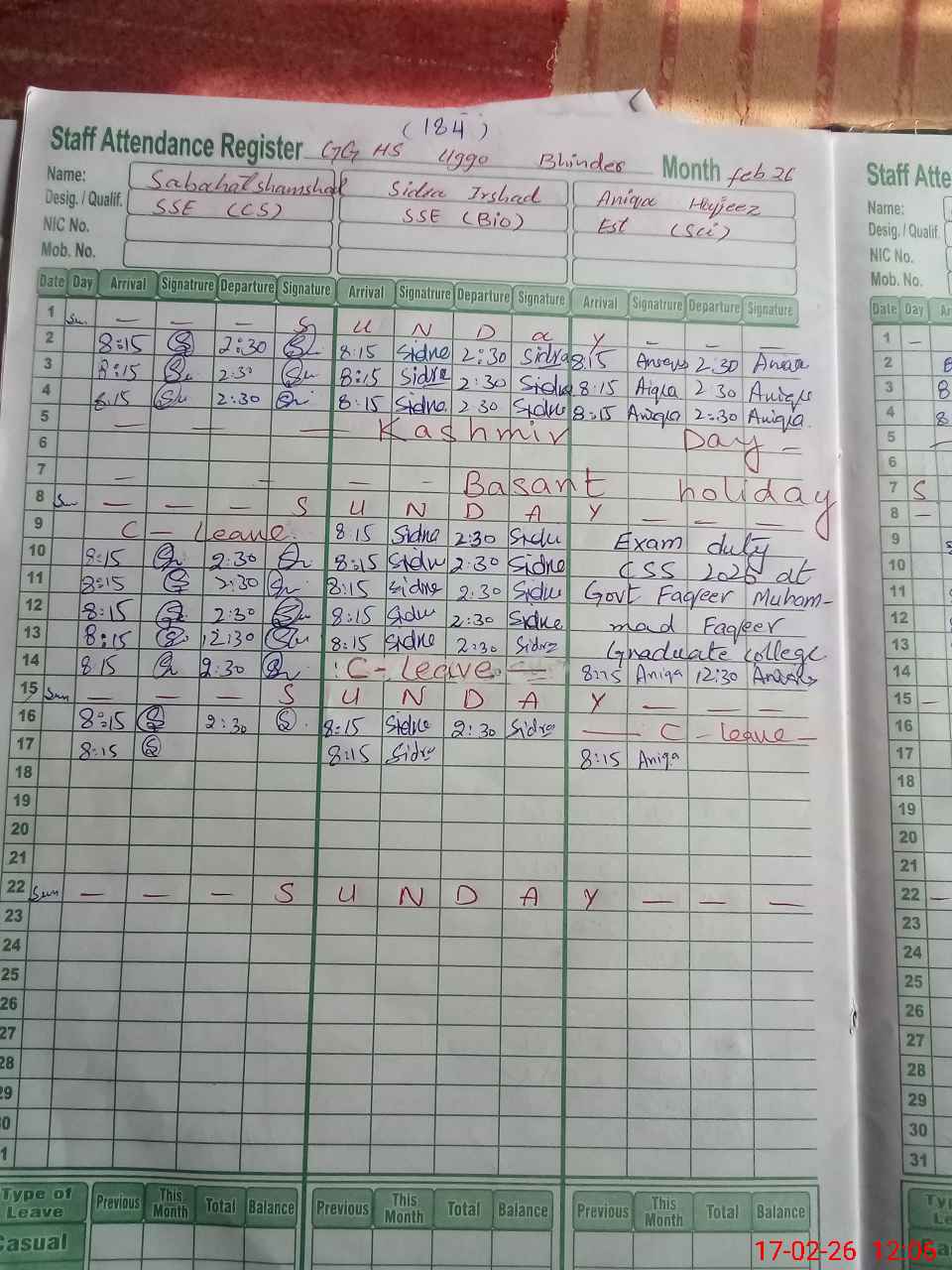 | CNIC | Full Name | Designation | R/C | Absence During Last Calender Month |