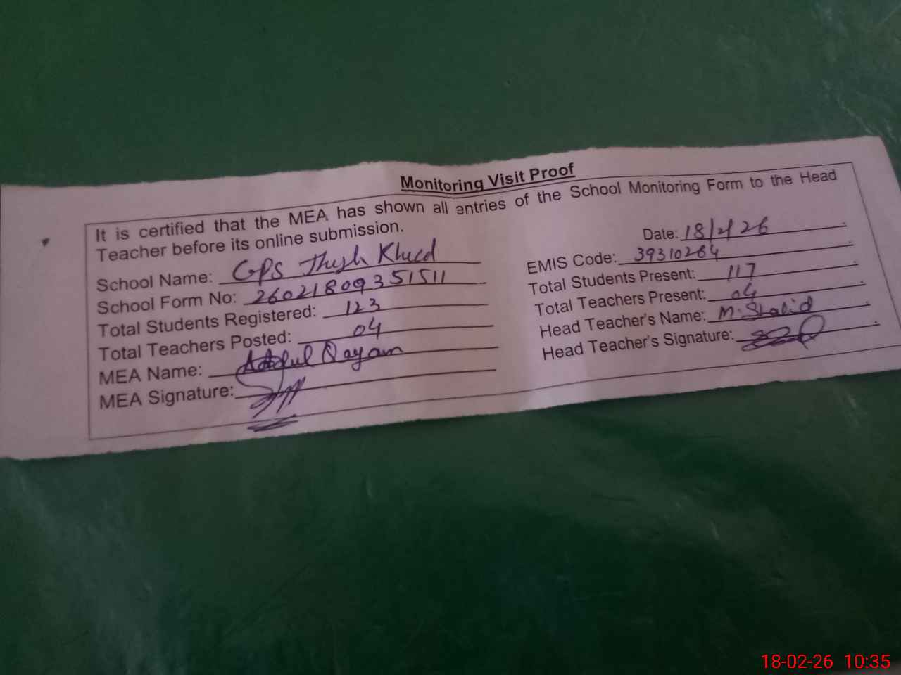 | Attendance Register | Head Teacher | MEA with School | Visit Proof |