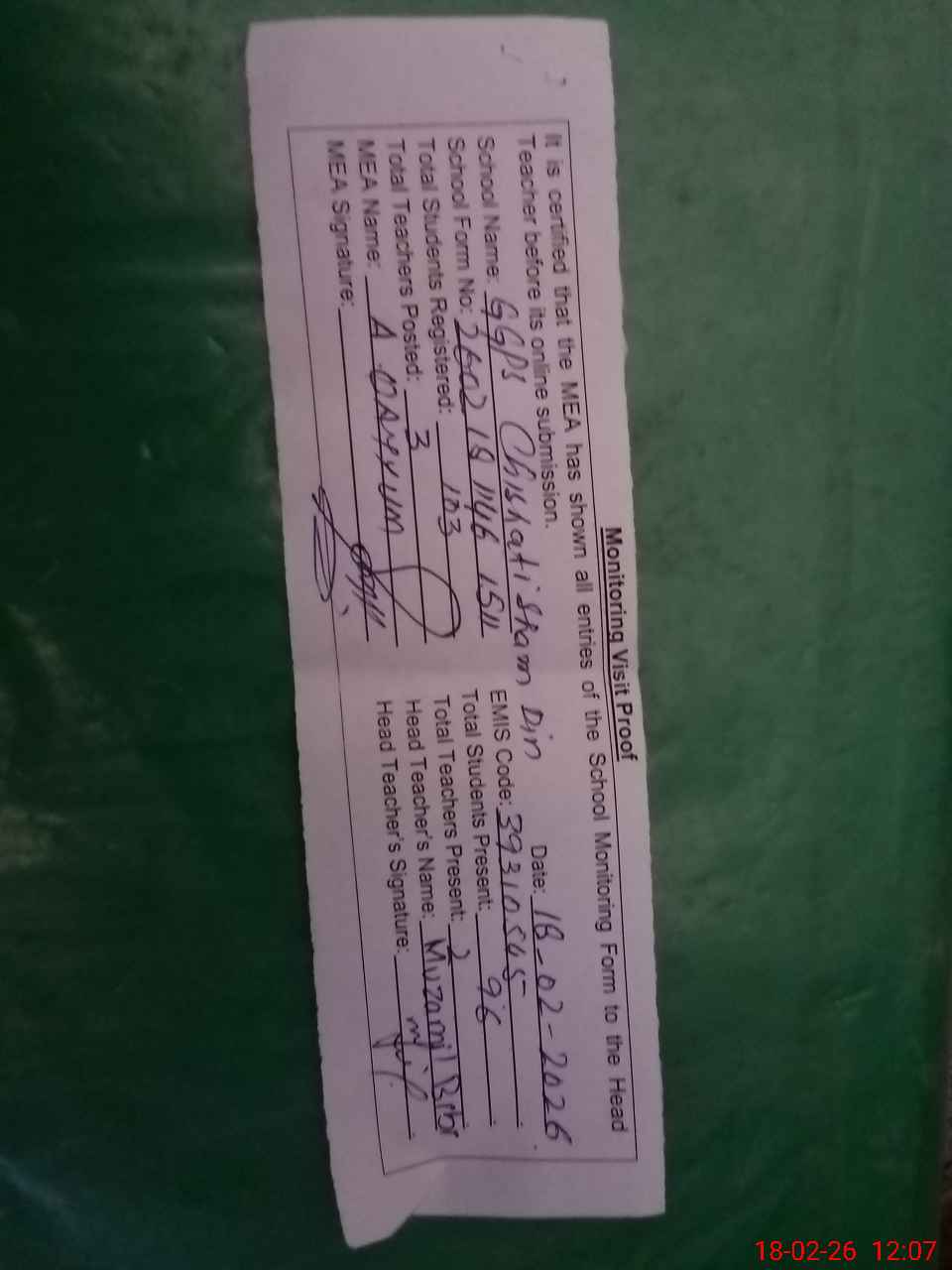 | Certified that this School was Inspected by the Undersigned MEA/DMO Today and the Information Stated Above is as Per Record. | |||||