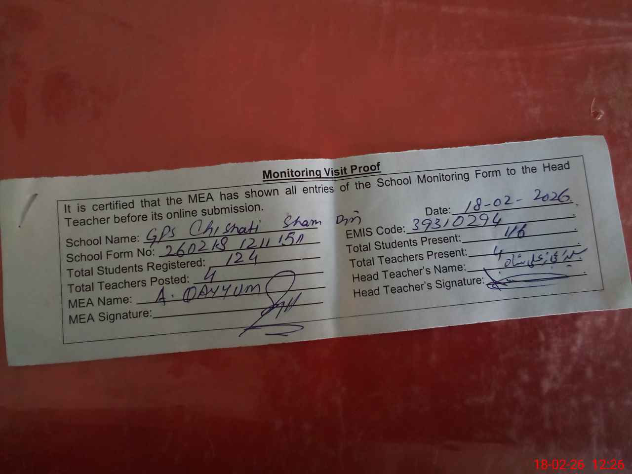 | Attendance Register | Head Teacher | MEA with School | Visit Proof |