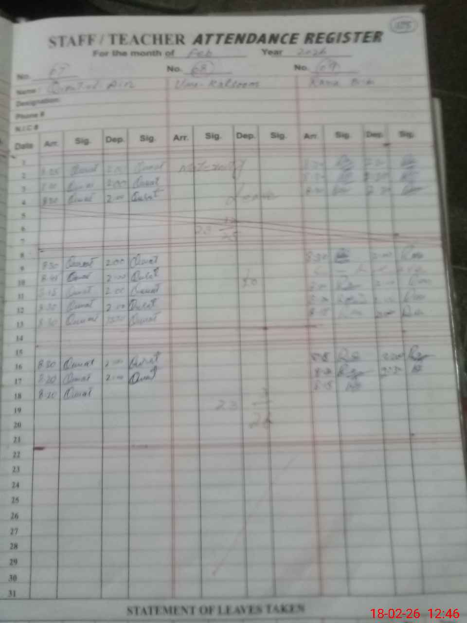 | CNIC | Full Name | Designation | R/C | Absence During Last Calender Month |