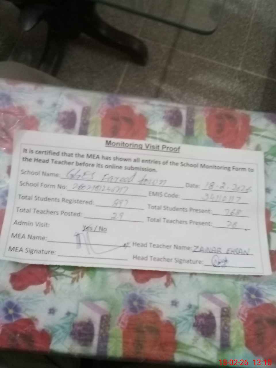 | Attendance Register | Head Teacher | MEA with School | Visit Proof |