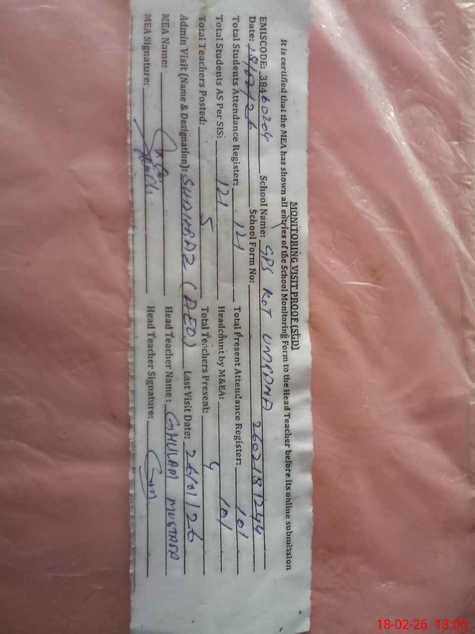 | Attendance Register | Head Teacher | MEA with School | Visit Proof |
