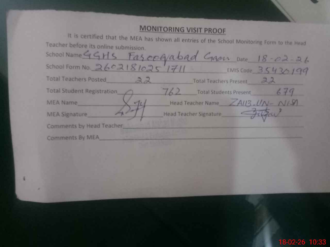 | Attendance Register | Head Teacher | MEA with School | Visit Proof |