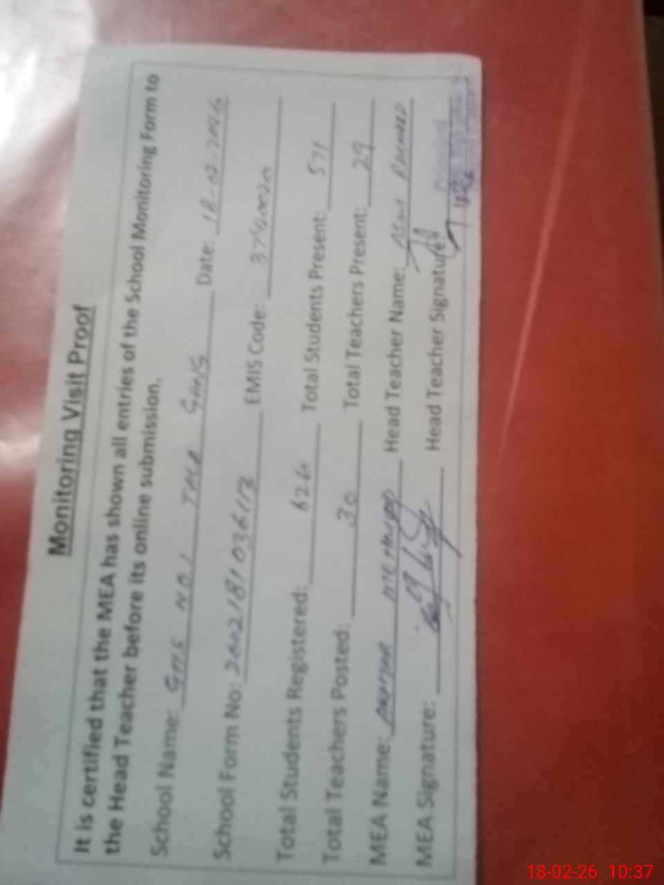 | Attendance Register | Head Teacher | MEA with School | Visit Proof |