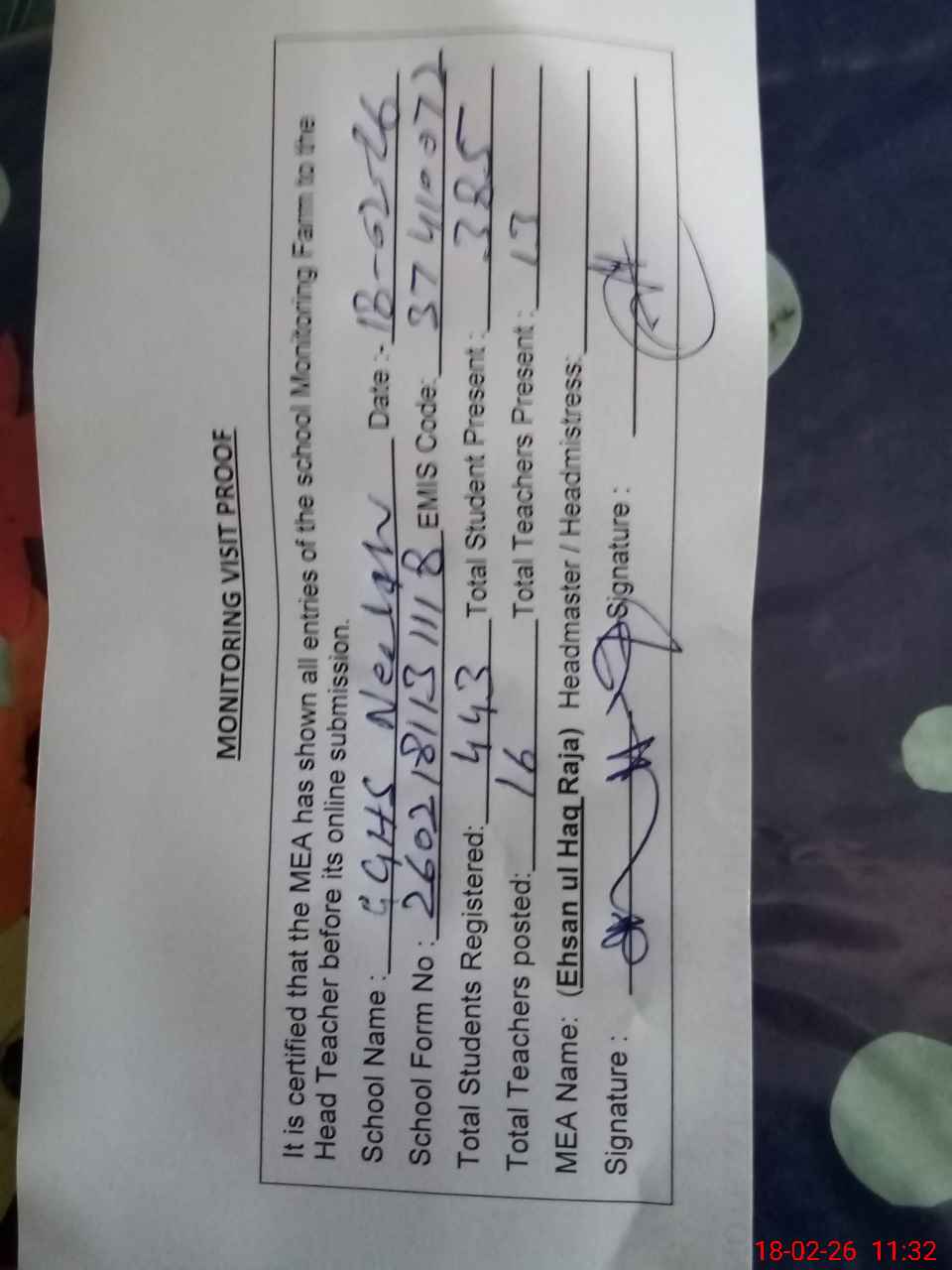 | Attendance Register | Head Teacher | MEA with School | Visit Proof |