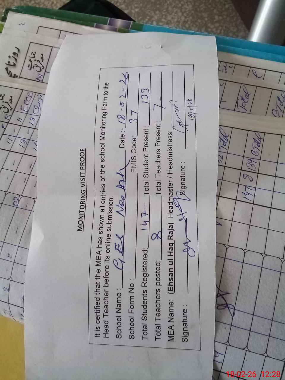 | Attendance Register | Head Teacher | MEA with School | Visit Proof |