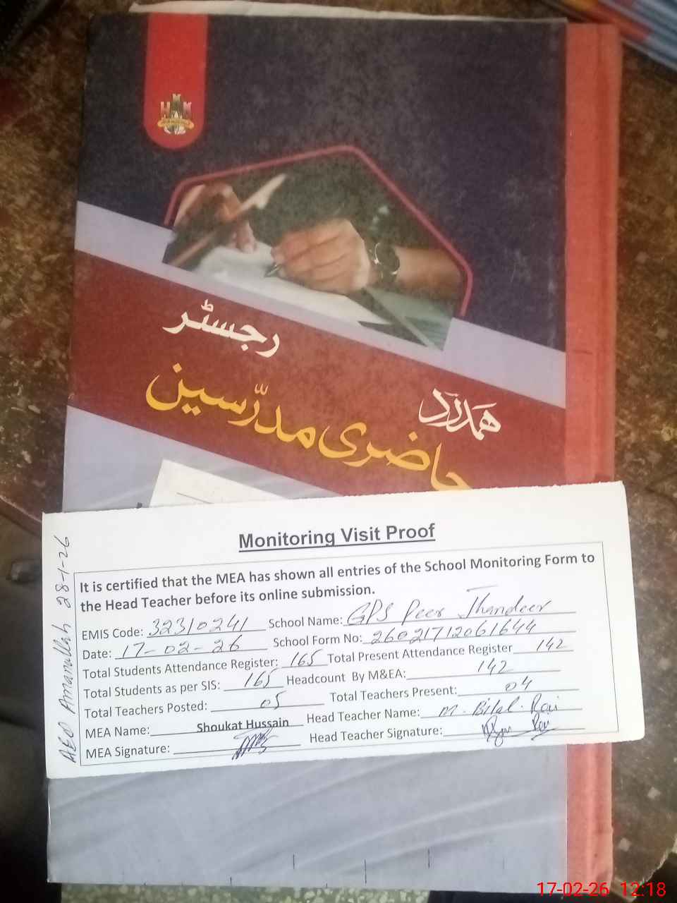 | Attendance Register | Head Teacher | MEA with School | Visit Proof |