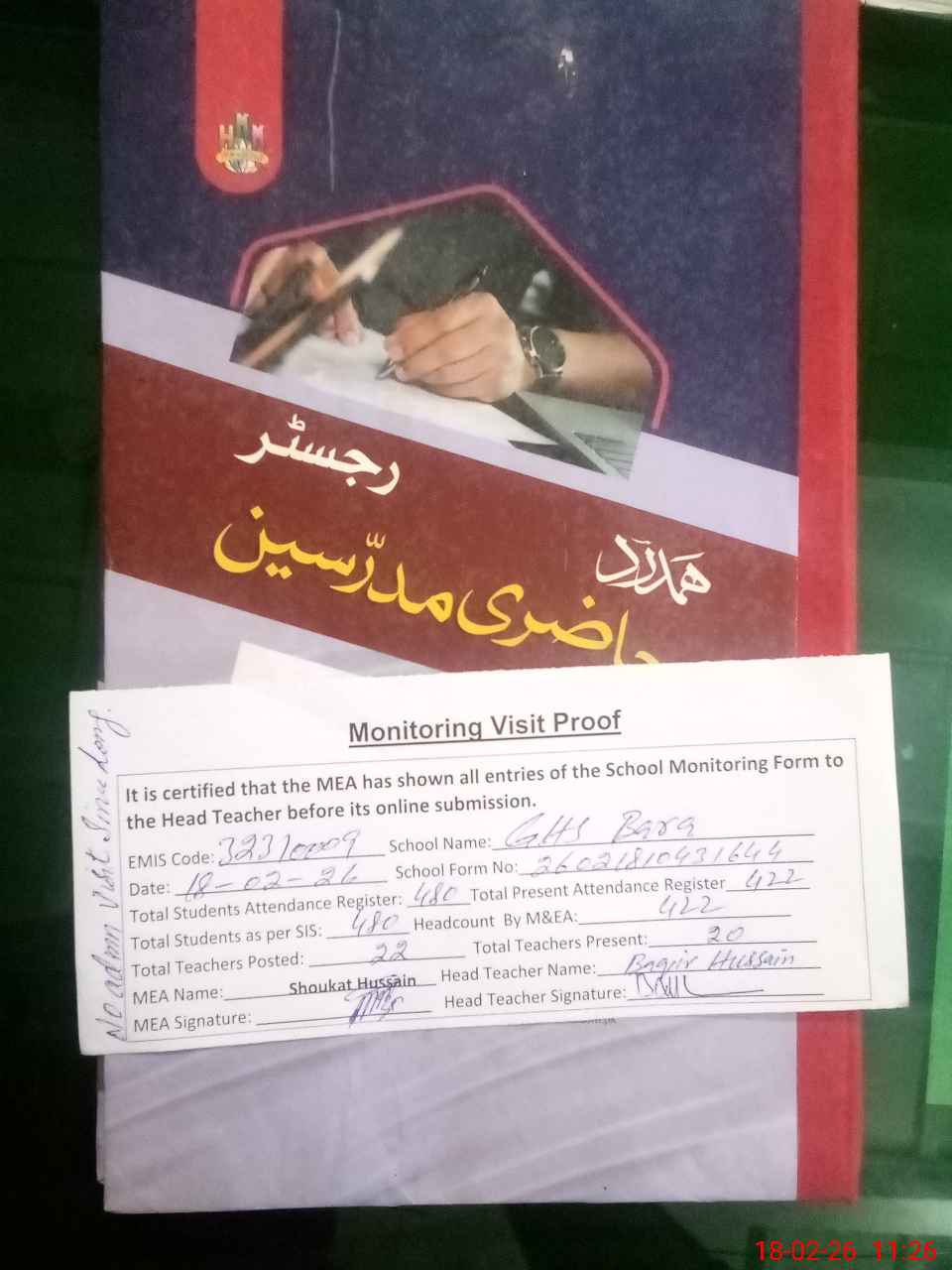 | Attendance Register | Head Teacher | MEA with School | Visit Proof |