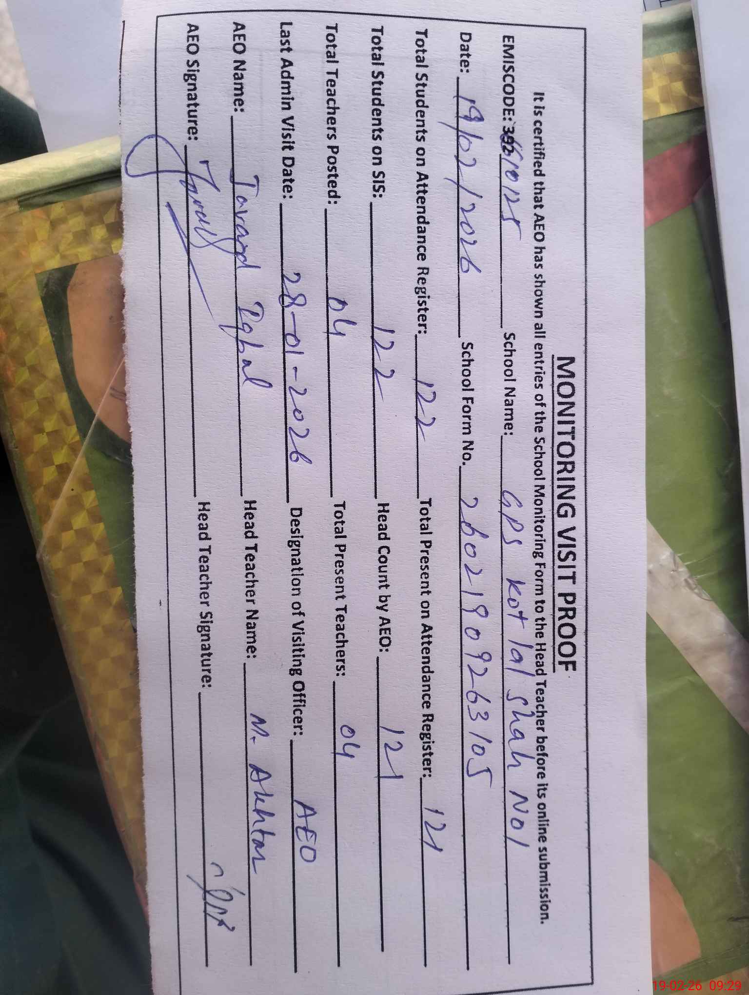 | EMIS Code: 36610125 | Name of School: GPS KOT LAL SHAH | |||