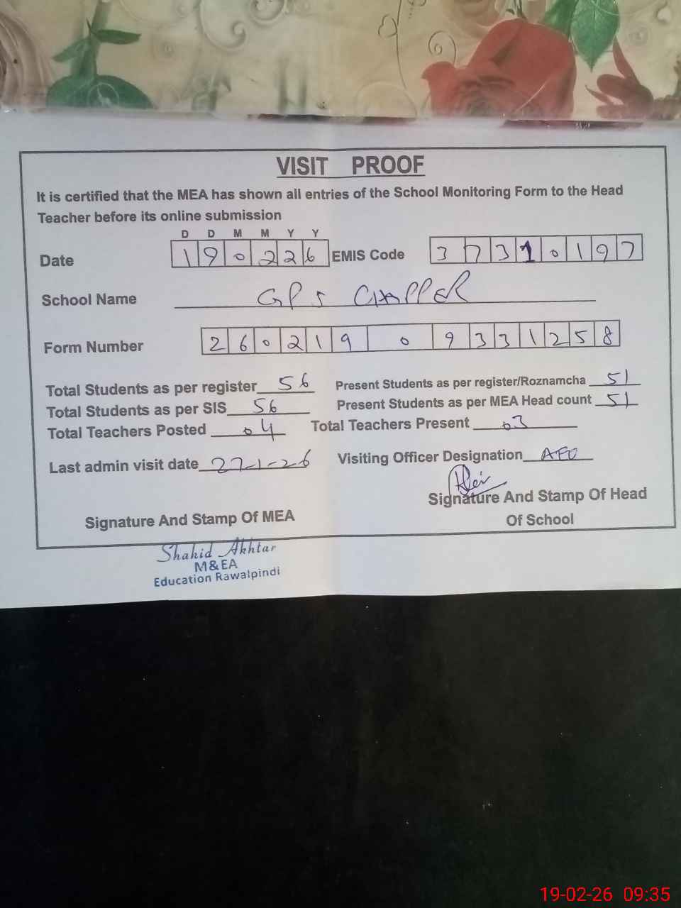 | Attendance Register | Head Teacher | MEA with School | Visit Proof |
