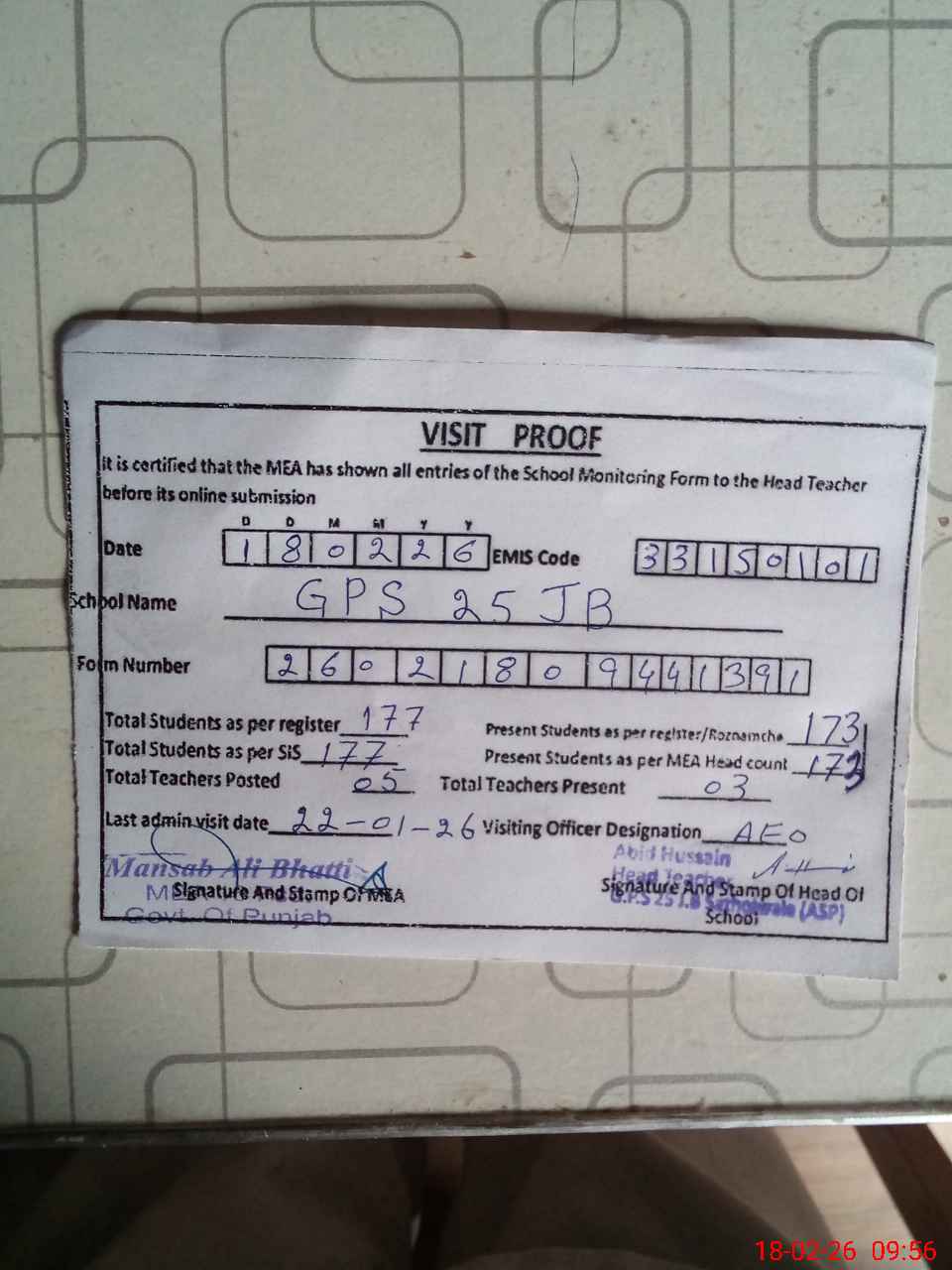 | EMIS Code: 33150101 | Name of School: GPS 25 JB | |||