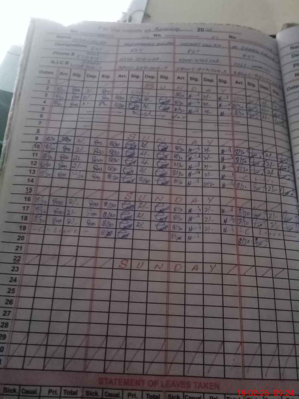 | CNIC | Full Name | Designation | R/C | Absence during last cal. month |