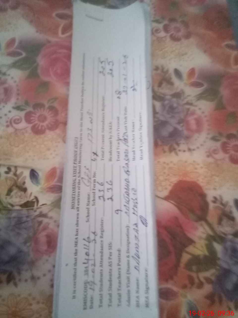 | Attendance Register | Head Teacher | MEA with School | Visit Proof |