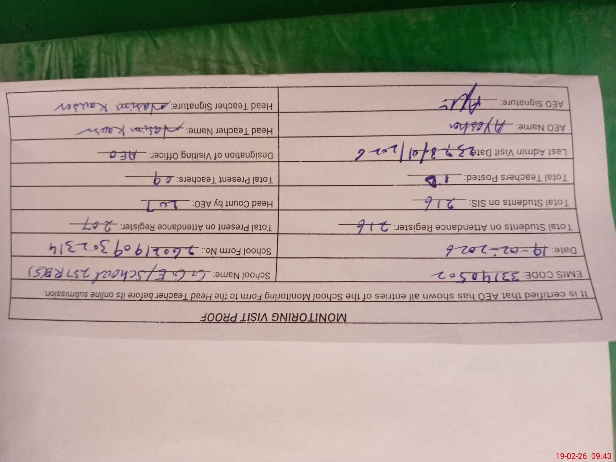 | Certified that this School was Inspected by the Undersigned MEA/DMO Today and the Information Stated Above is as Per Record. | |||||