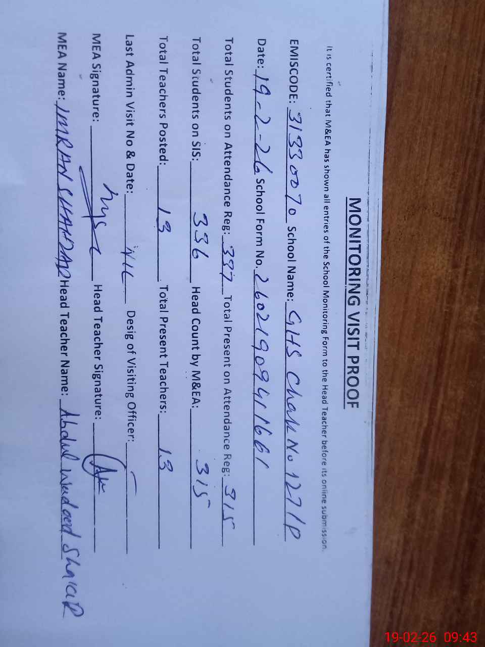| EMIS Code: 31330070 | Name of School: GHS CHAK NO. 127/P | |||
