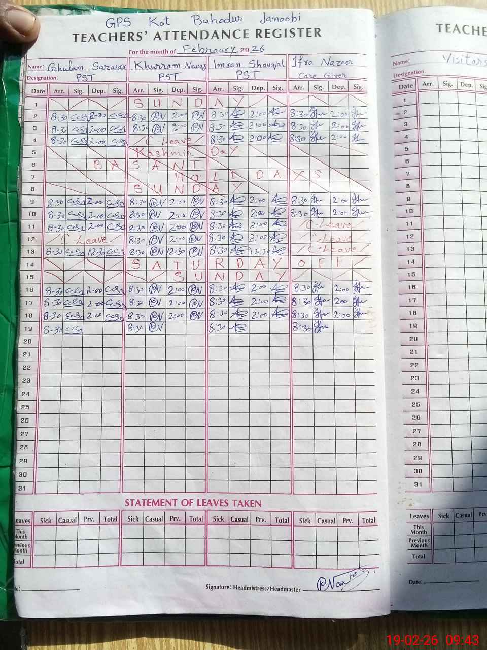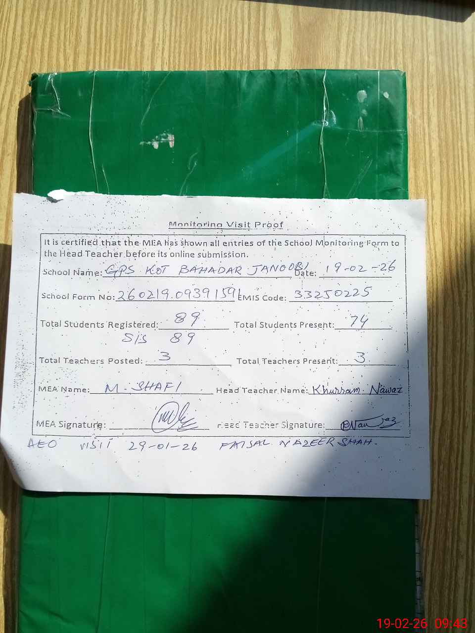 | Attendance Register | Head Teacher | MEA with School | Visit Proof |