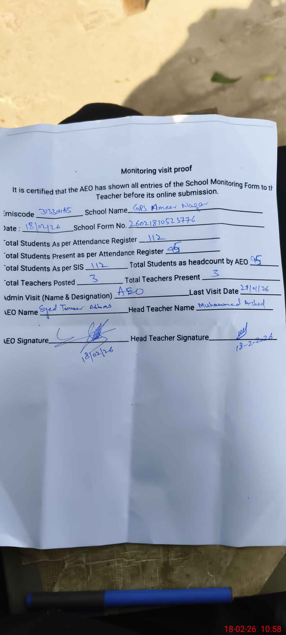 | Monitoring Date: 18-02-2026 | Start Time: 18-02-2026 10:28 AM | End Time: 18-02-2026 11:05 AM | Name of MEA: Sy**** Ta**** Ab**** Bu**** | |