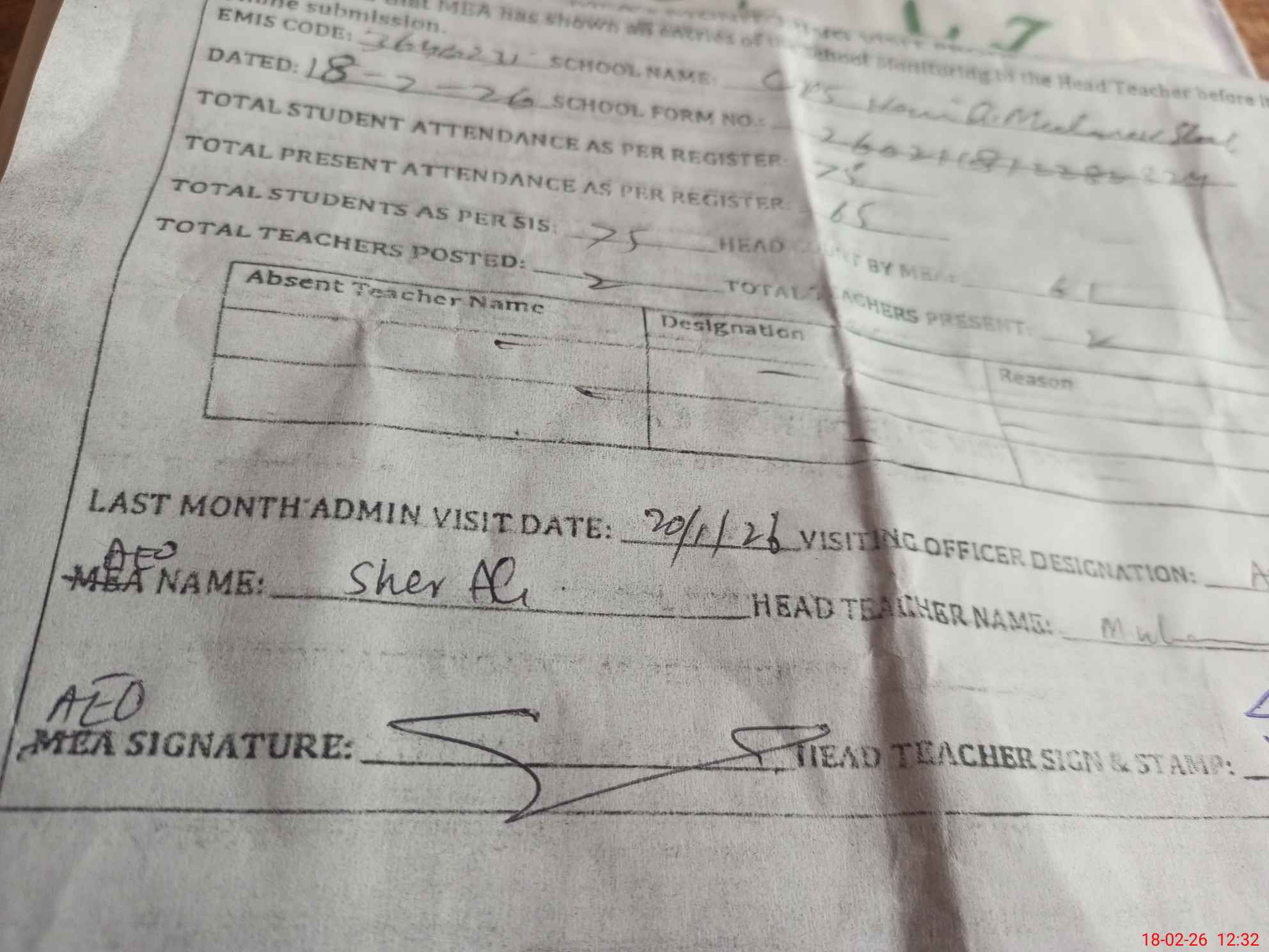 | Attendance Register | Head Teacher | MEA with School | Visit Proof |