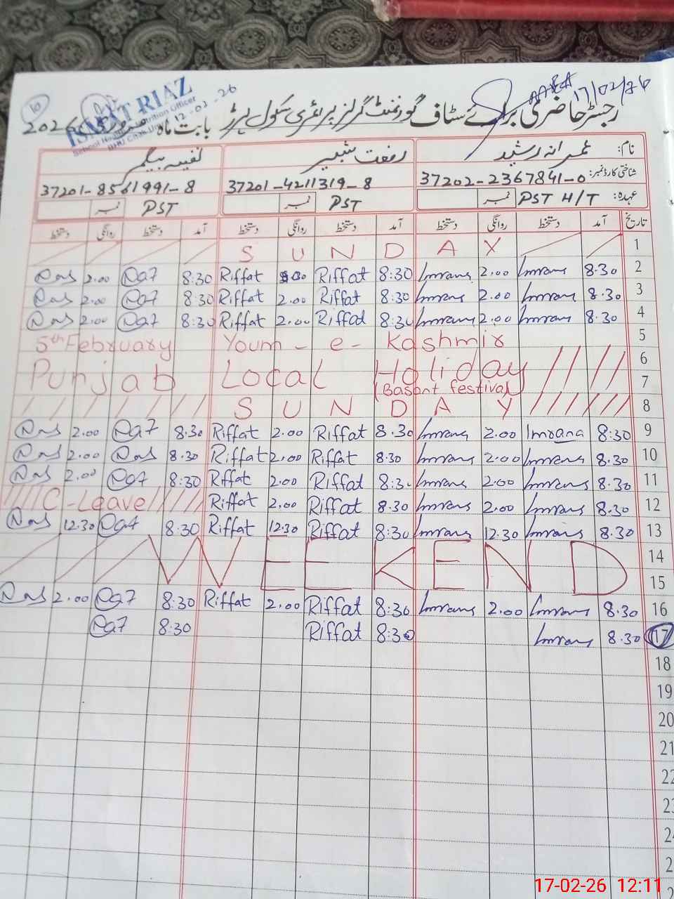 | CNIC | Full Name | Designation | R/C | Absence During Last Calender Month |