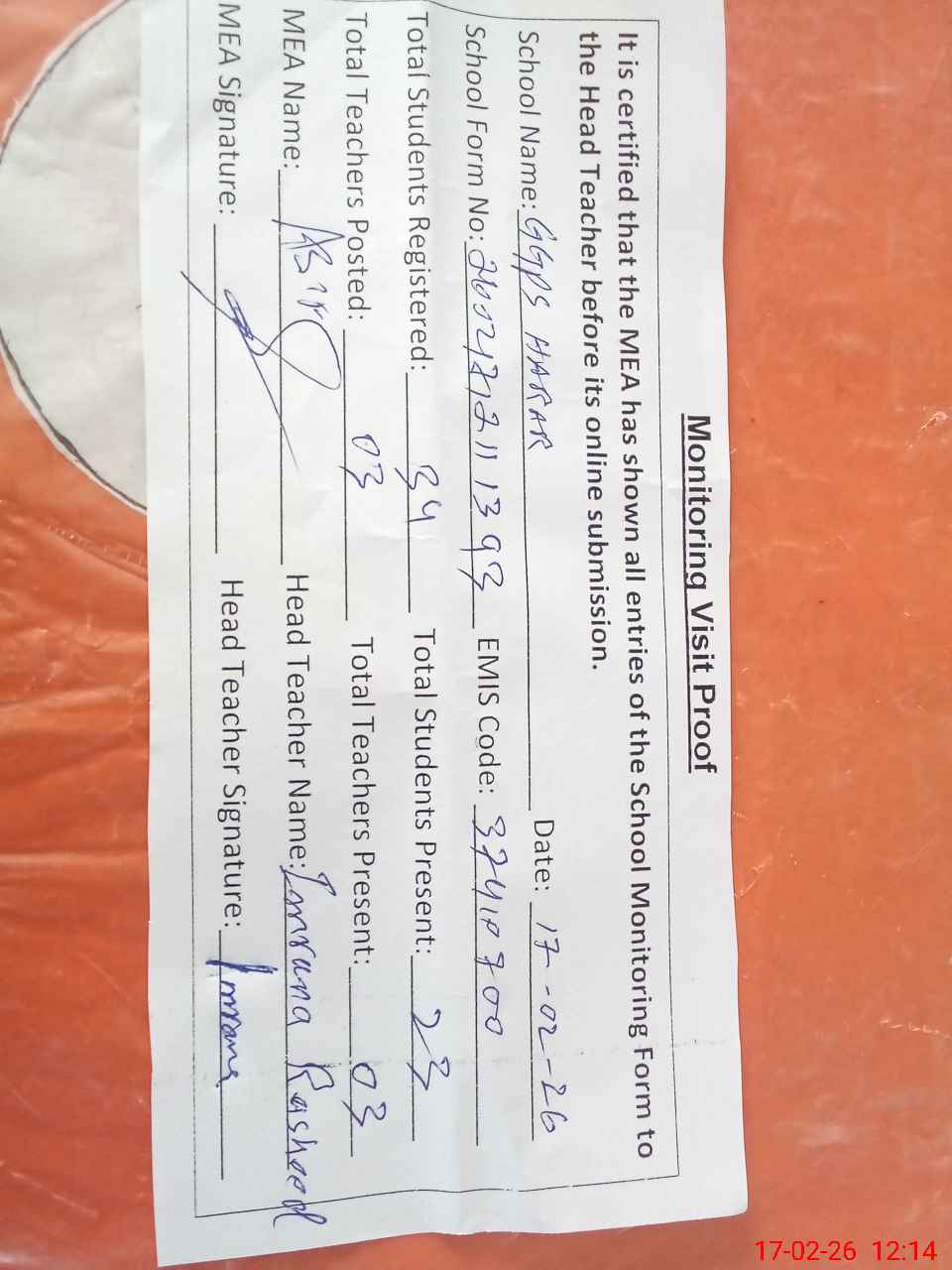 | Attendance Register | Head Teacher | MEA with School | Visit Proof |