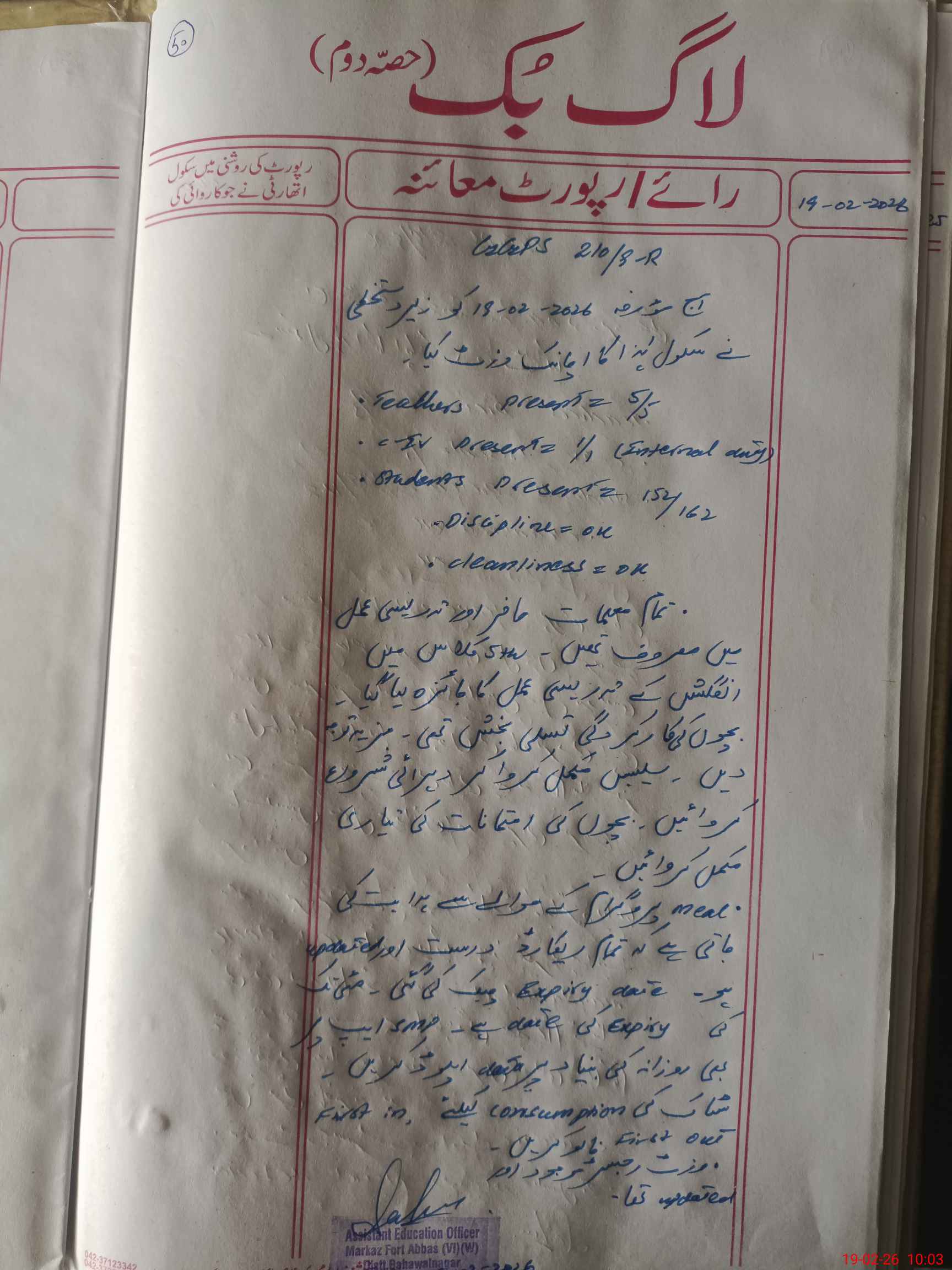 | Certified that this School was Inspected by the Undersigned MEA/DMO Today and the Information Stated Above is as Per Record. | |||||