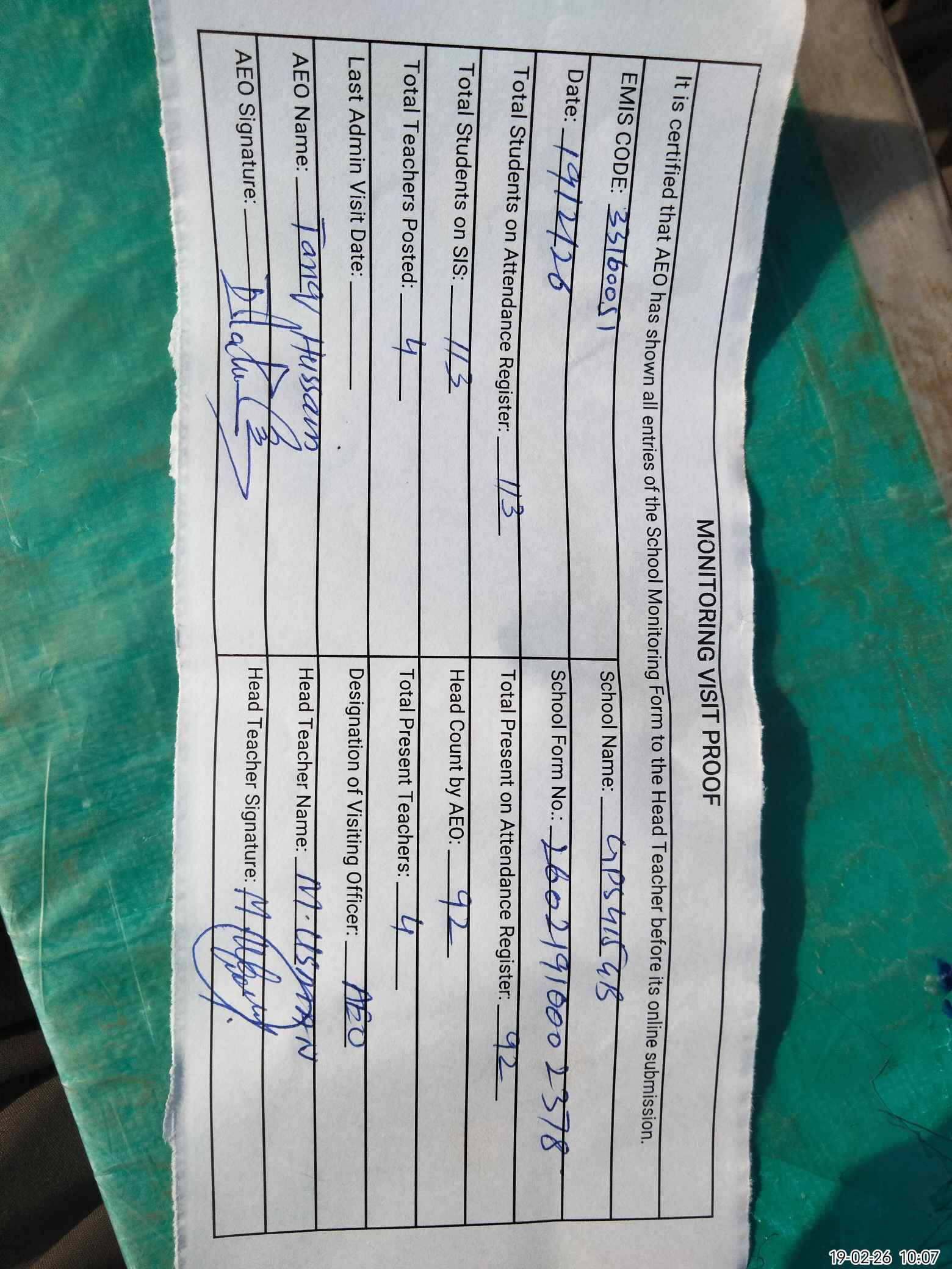 | Certified that this School was Inspected by the Undersigned MEA/DMO Today and the Information Stated Above is as Per Record. | |||||