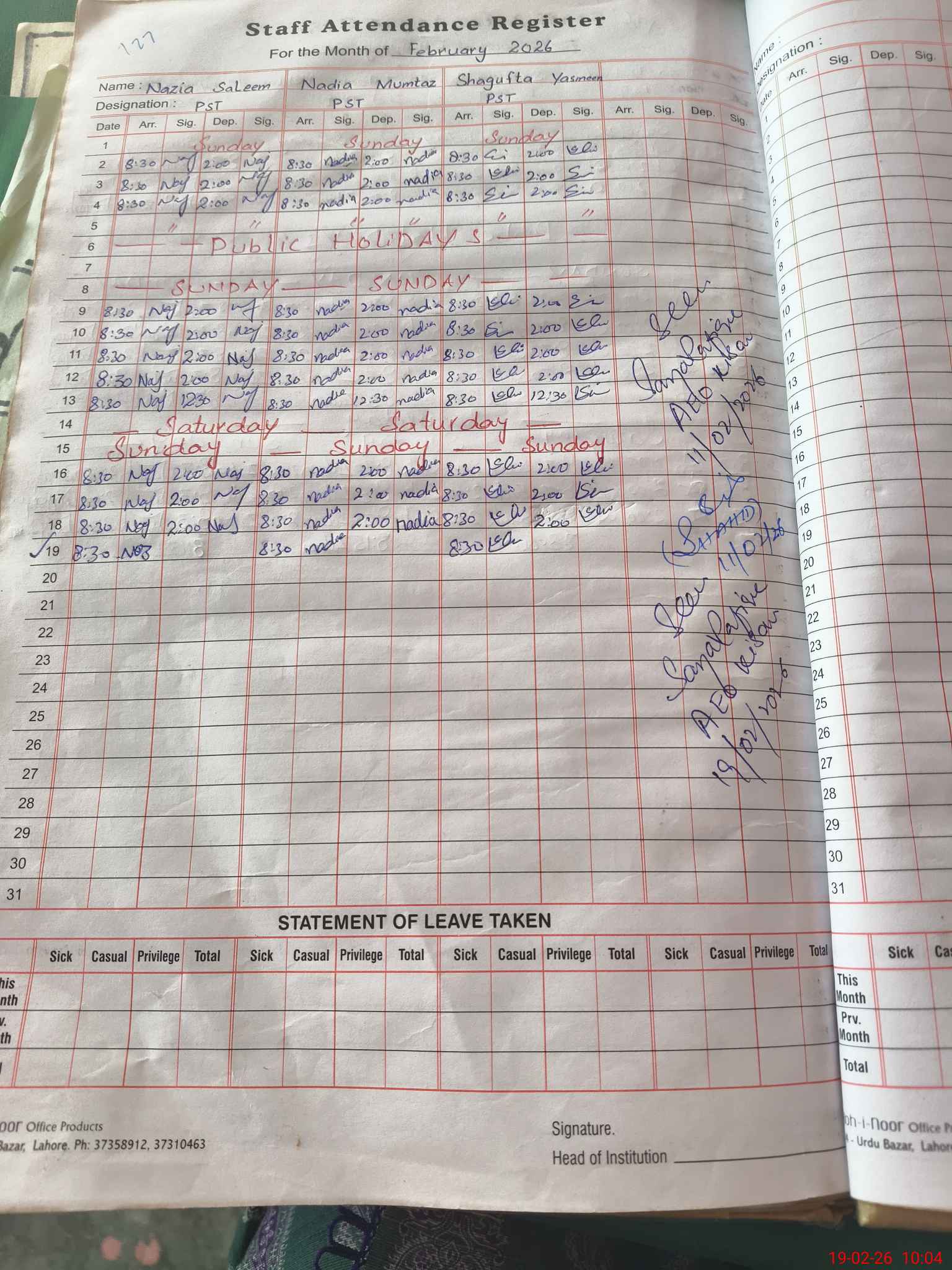 | Name: Aq**** Ir**** Designation: (School Headmaster's/Headmistress's) PST Phone/Cell Number: 03**** |