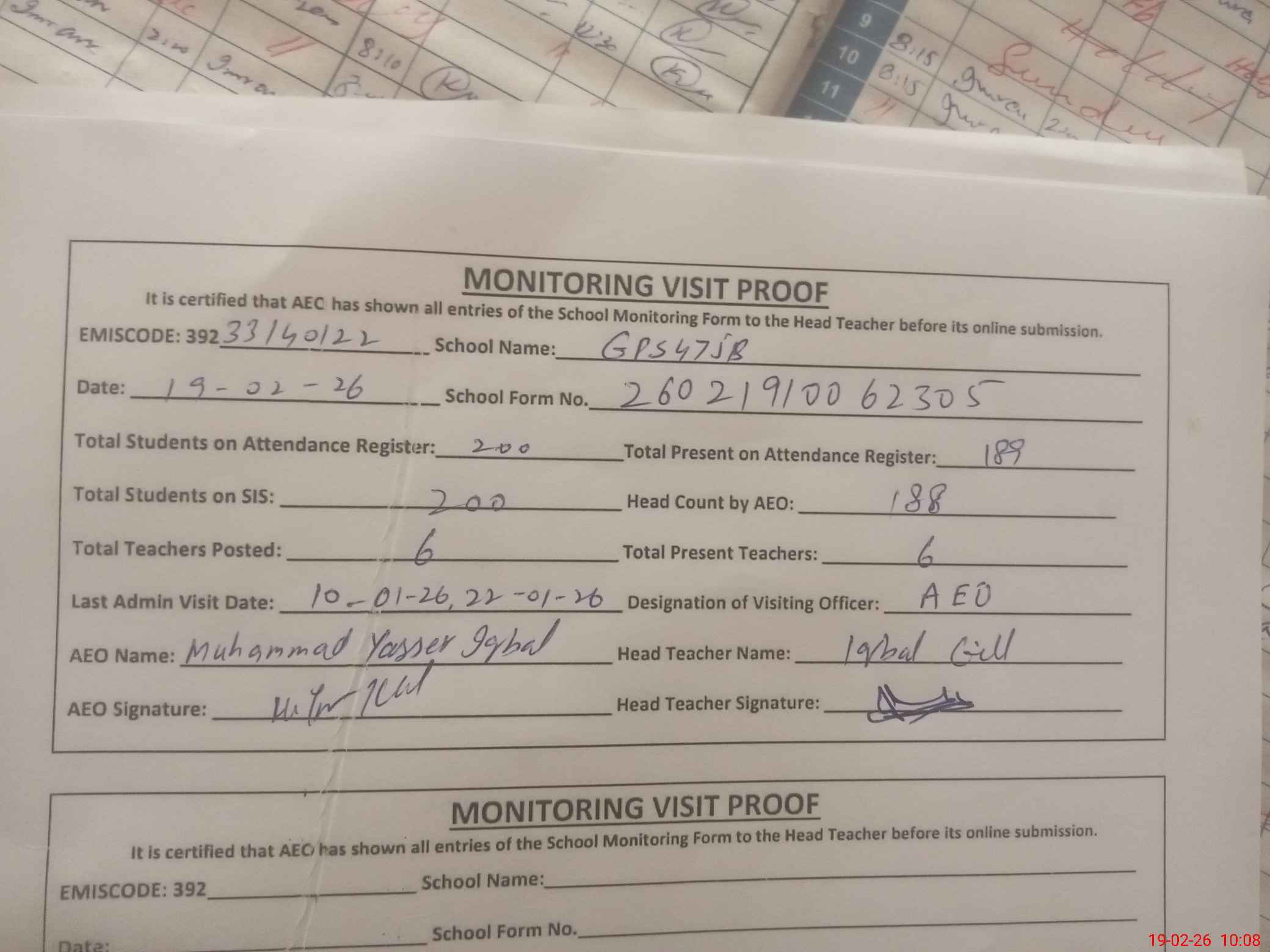 | Attendance Register | Head Teacher | MEA with School | Visit Proof |