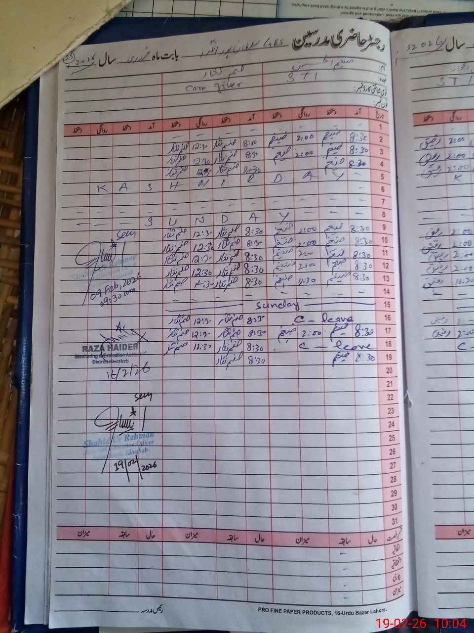 | CNIC | Full Name | Designation | R/C | Absence During Last Calender Month |