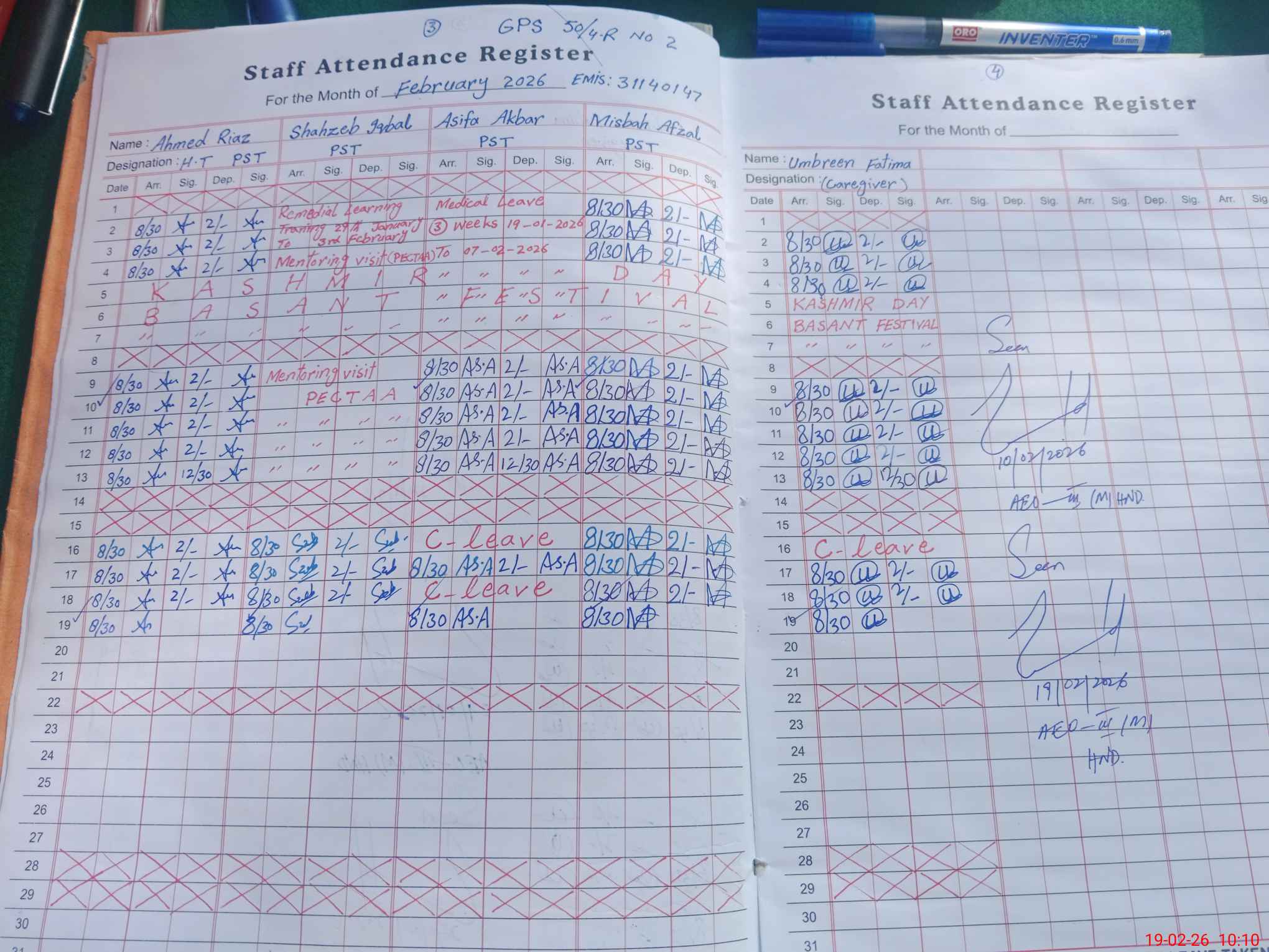 | Attendance Register | Head Teacher | MEA with School | Visit Proof |