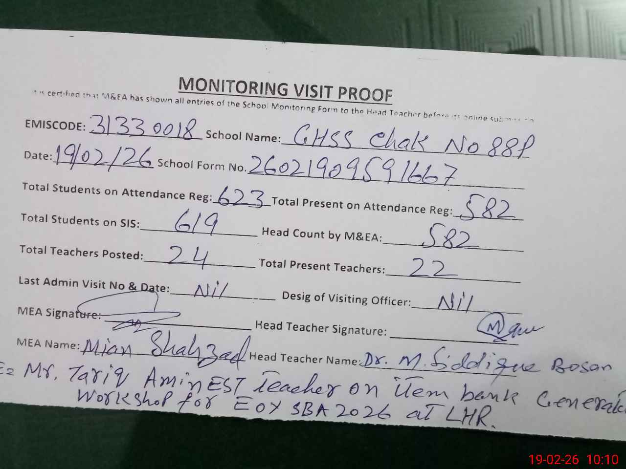 | Remarks (Use Separate Page if Required): Mr Tariq Amin EST teacher on item bank generation workshop for EOY SBA 2026 at Lahore. | |||||