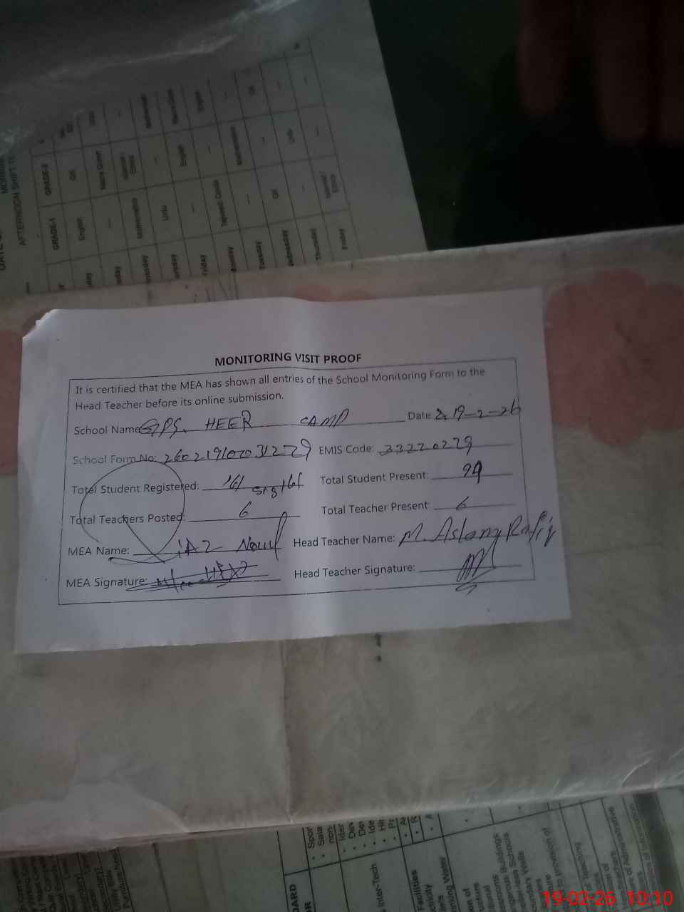 | Attendance Register | Head Teacher | MEA with School | Visit Proof |