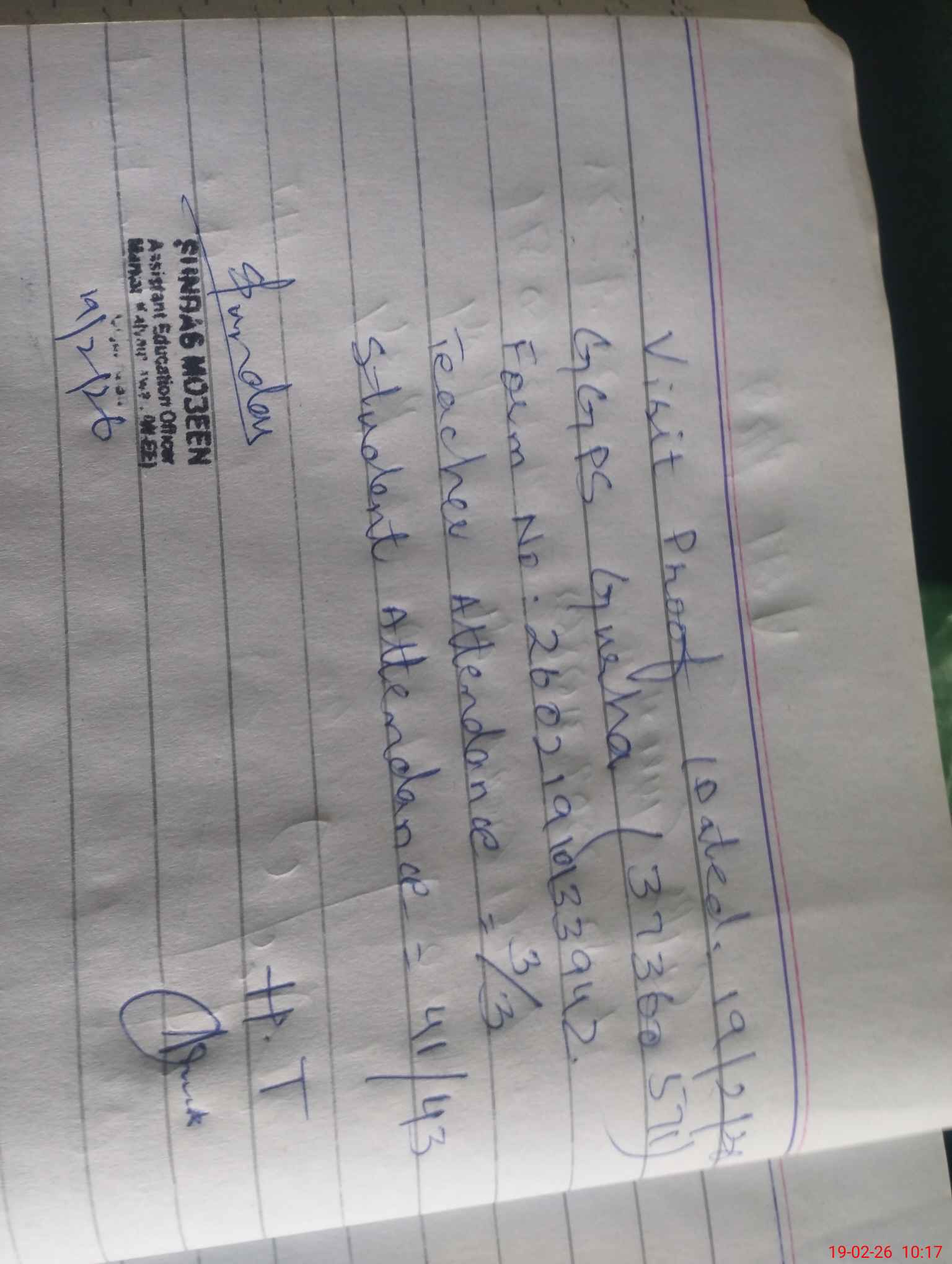 | Attendance Register | Head Teacher | MEA with School | Visit Proof |