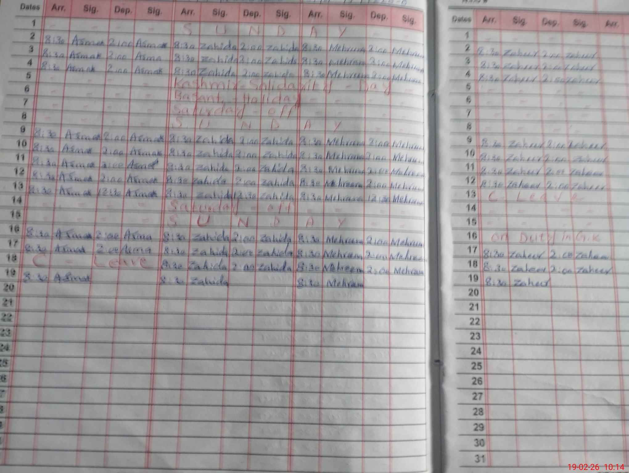 | Leave | Duty | Absent | Maternity | Medical | Ex- Pak |