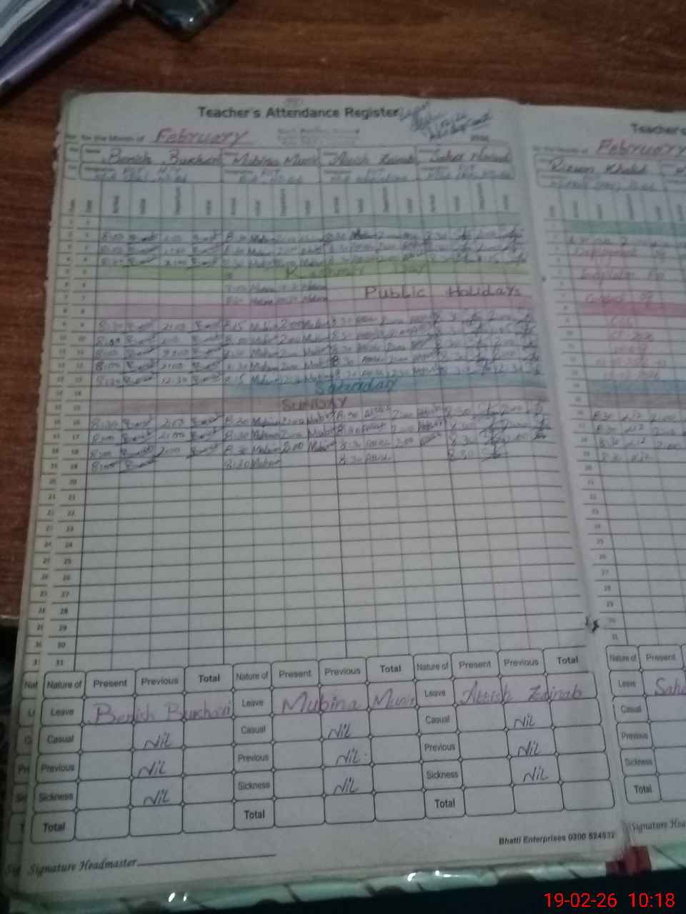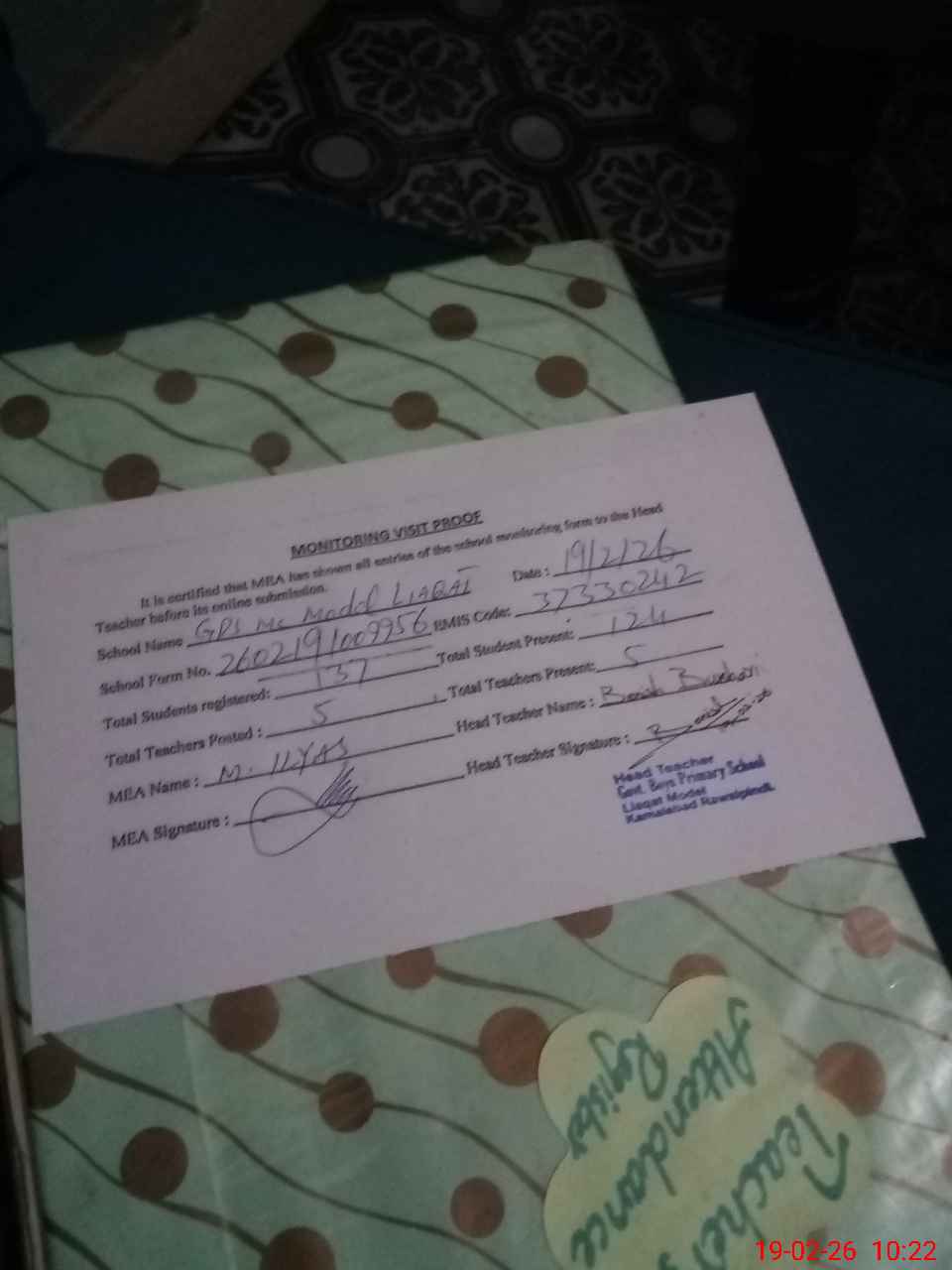 | Attendance Register | Head Teacher | MEA with School | Visit Proof |