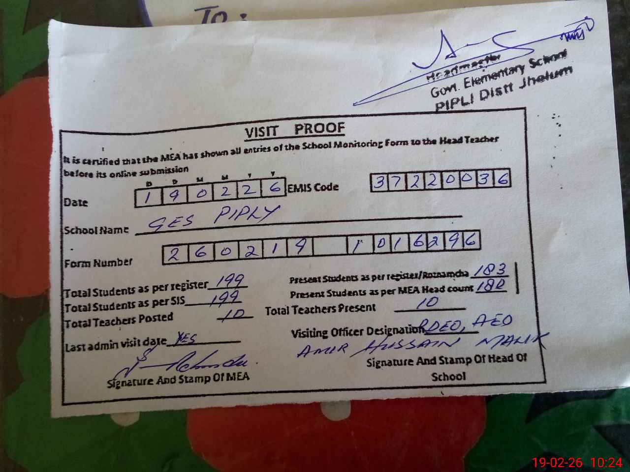 | Certified that this School was Inspected by the Undersigned MEA/DMO Today and the Information Stated Above is as Per Record. | |||||