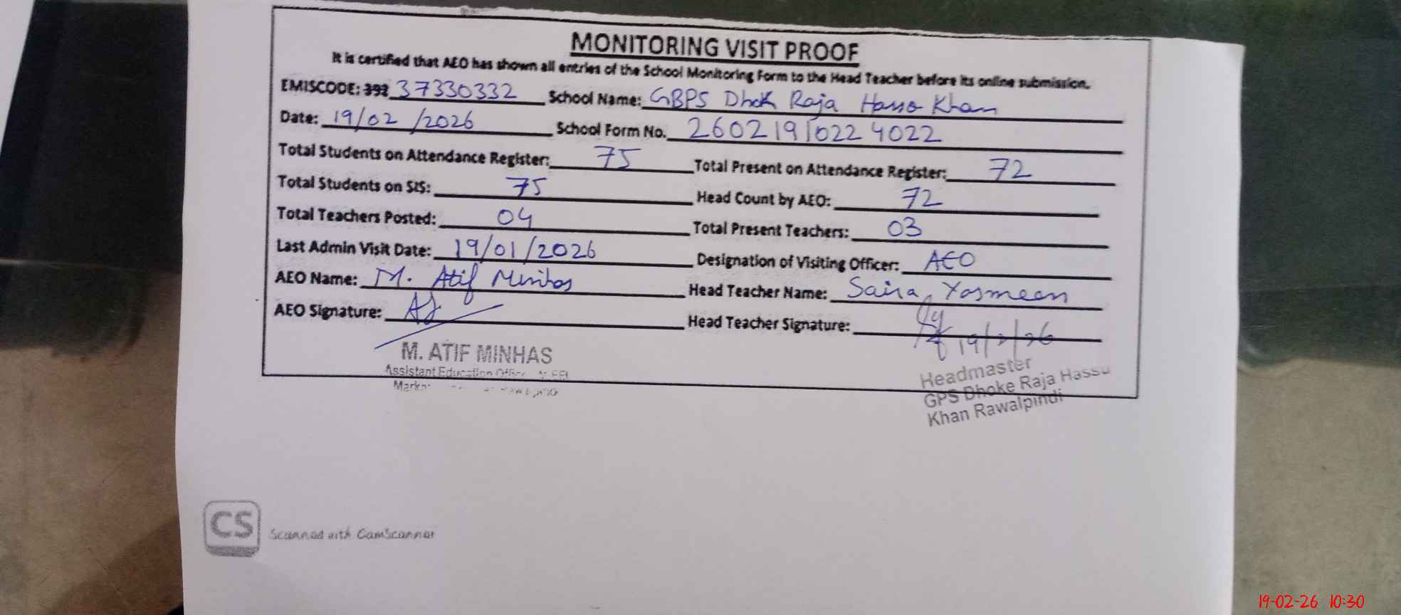 | EMIS Code: 37330332 | Name of School: GPS DHOK RAJA HUSSO KHAN | |||