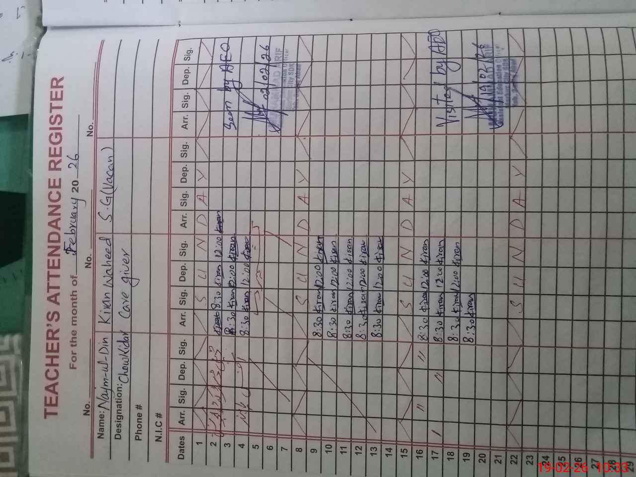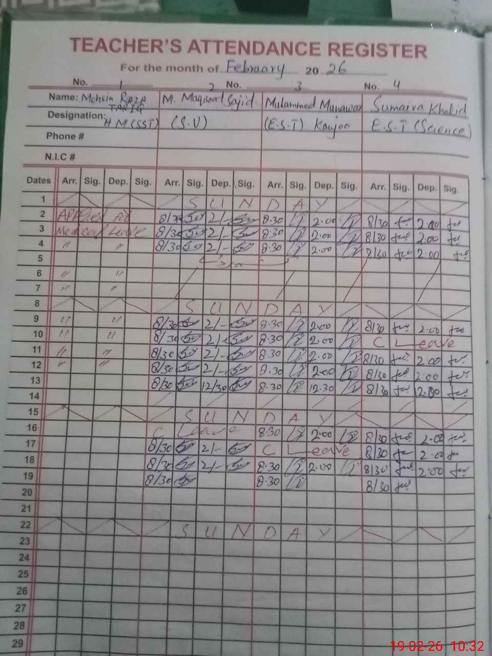 | CNIC | Full Name | Designation | R/C | Absence During Last Calender Month |