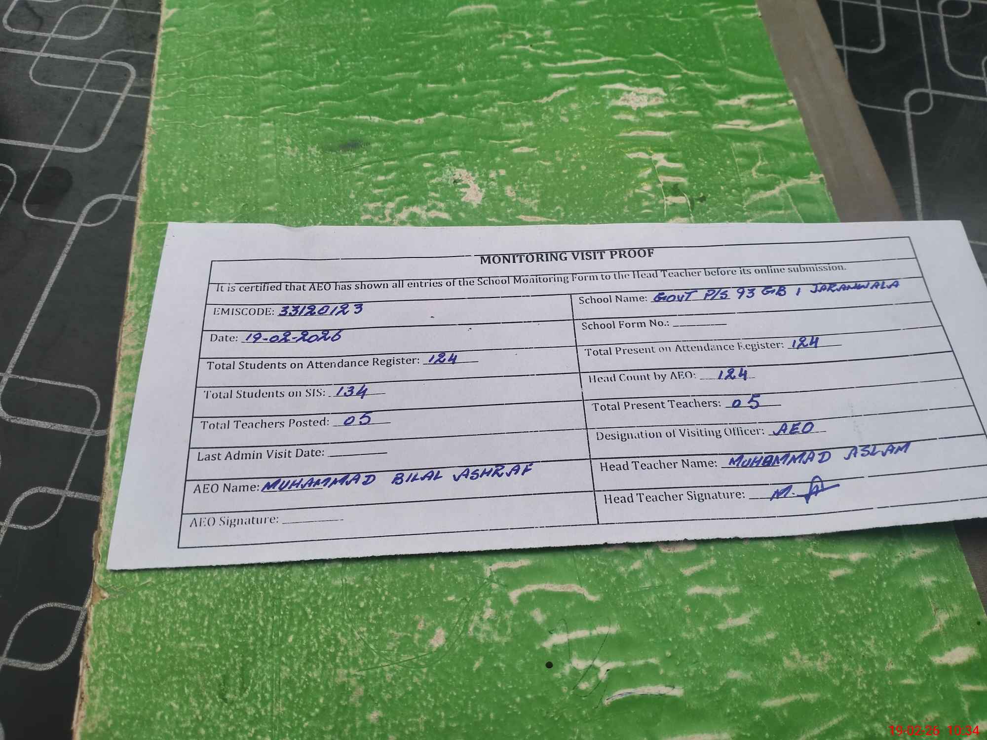 | District: FAISALABAD | Tehsil: JARANWALA | Markaz: PULL 93 GB - MALE | Level: Primary | |