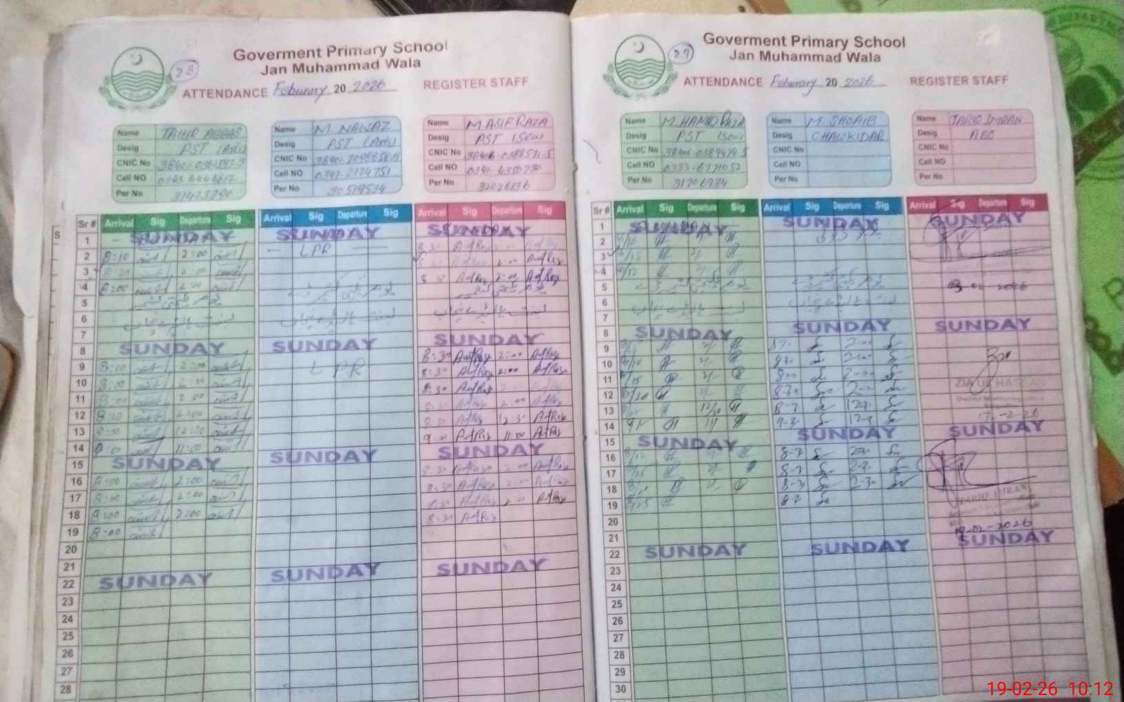 | CNIC | Full Name | Designation | R/C | Absence during last cal. month |