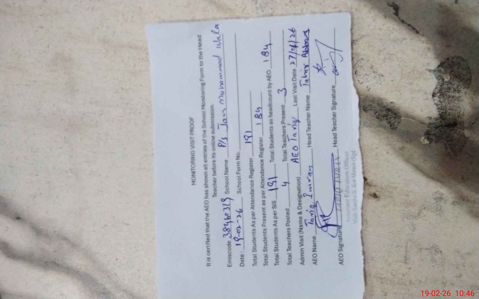 | Certified that this School was Inspected by the Undersigned MEA/DMO Today and the Information Stated Above is as Per Record. | |||||