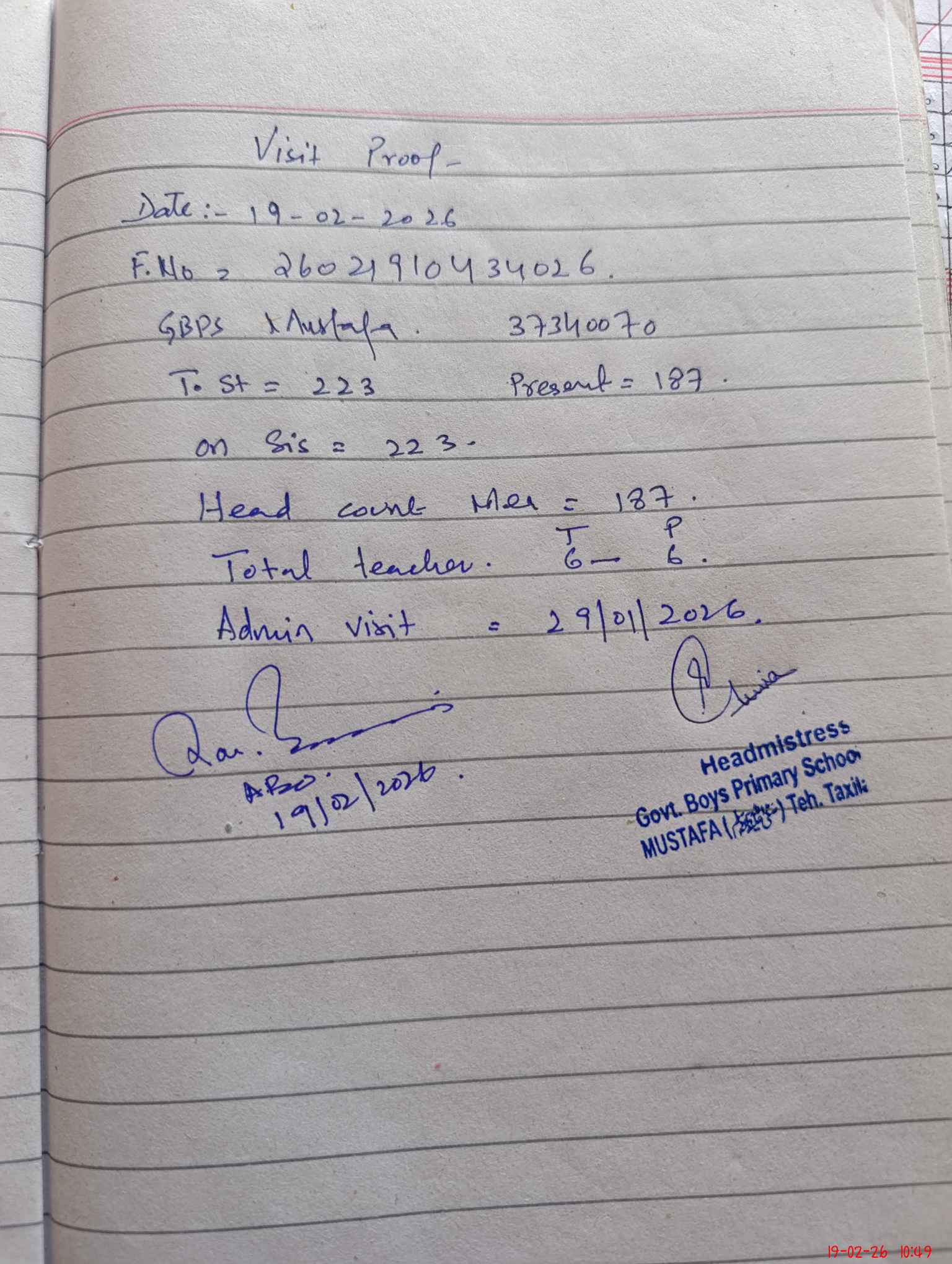 | Attendance Register | Head Teacher | MEA with School | Visit Proof |
