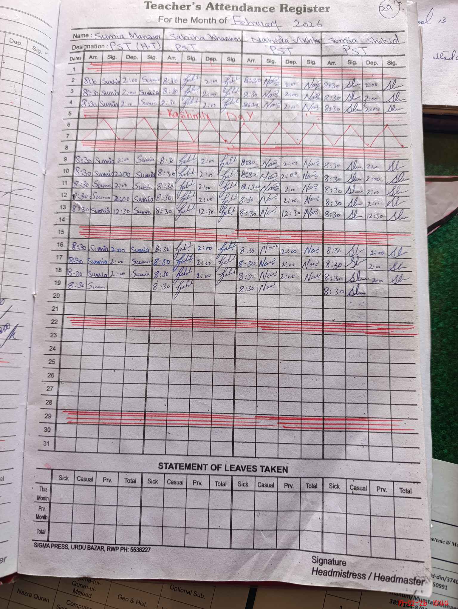 | Leave | Duty | Absent | Maternity | Medical | Ex- Pak |