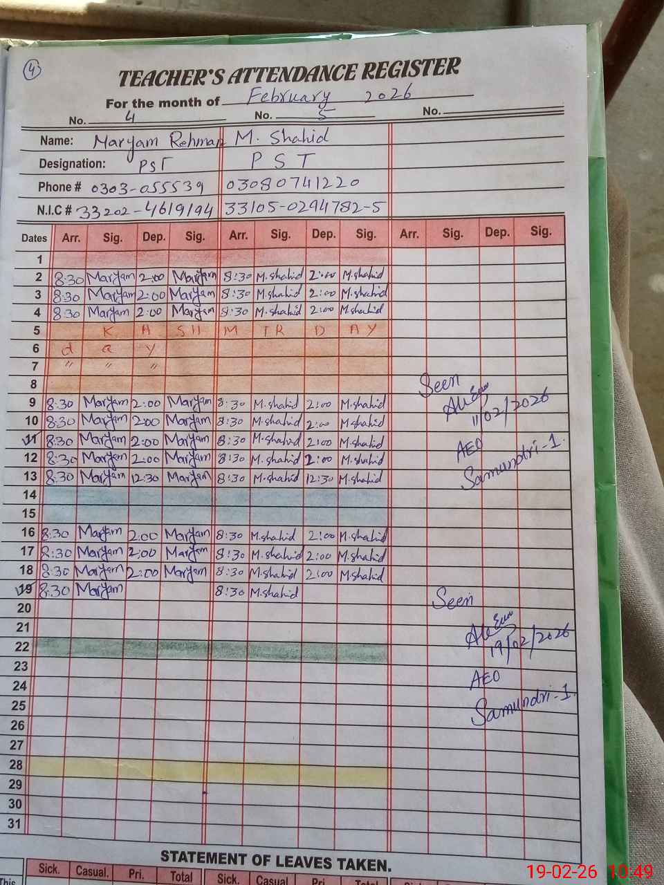| Name: MU**** AM**** Designation: (School Headmaster's/Headmistress's) PTC Phone/Cell Number: 03**** |