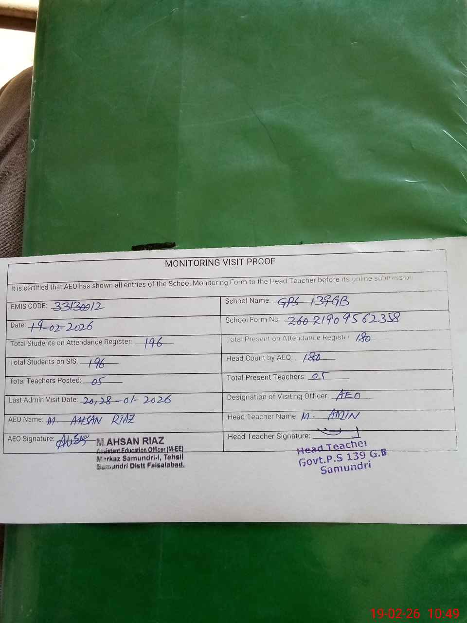 | EMIS Code: 33130012 | Name of School: GPS CHAK 139 GB SAMUNDRI | |||