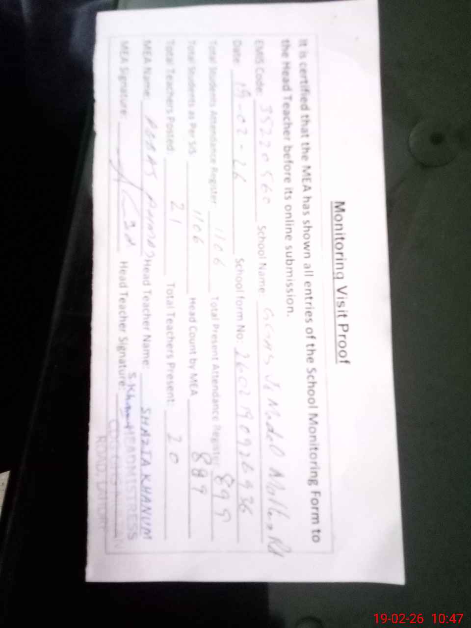 | EMIS Code: 35220560 | Name of School: GGHS JUNIOR MODEL MULTAN ROAD (EX-MCL) | |||