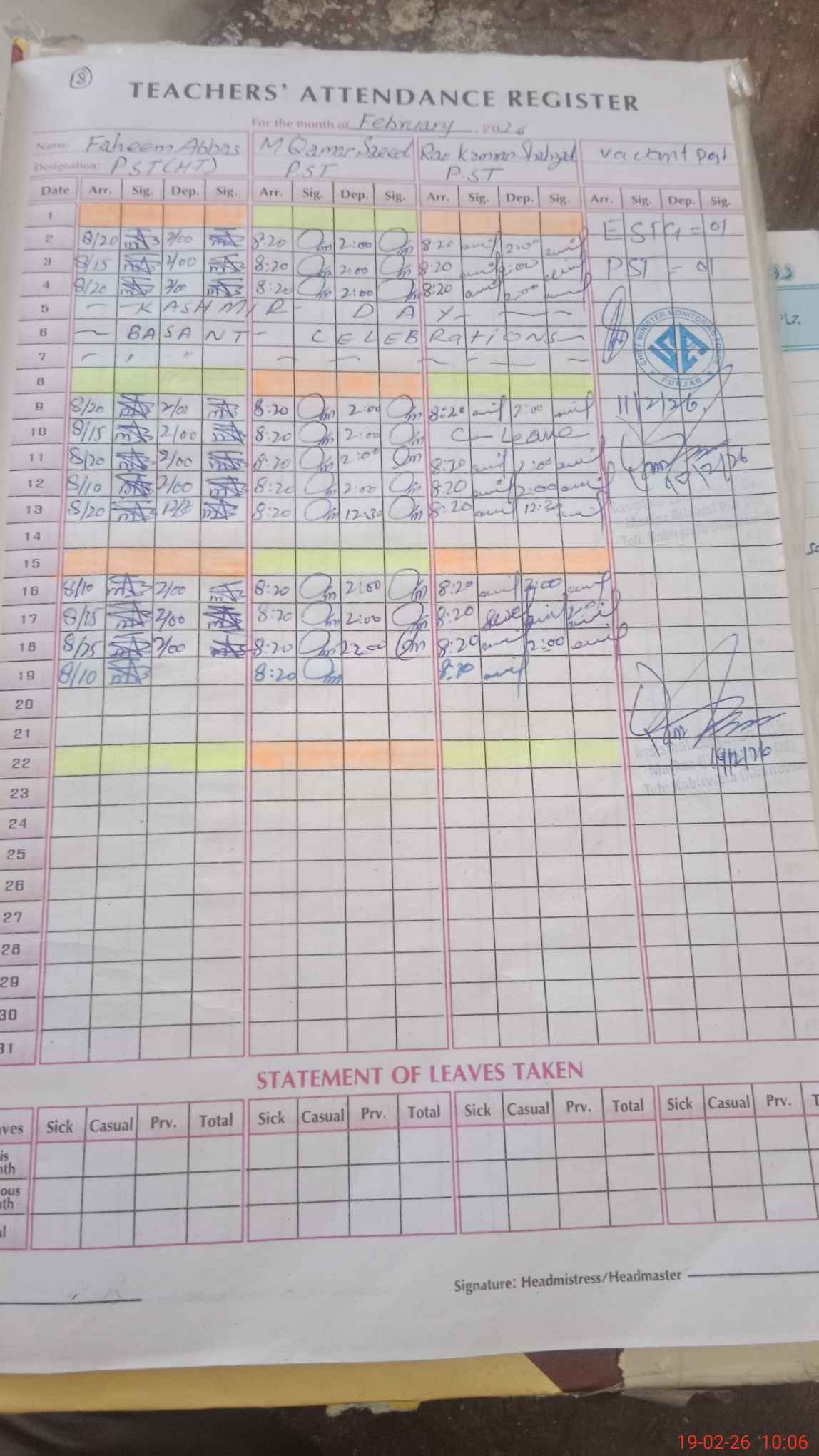 | Name: FA**** AB**** Designation: (School Headmaster's/Headmistress's) PST Phone/Cell Number: 03**** |
