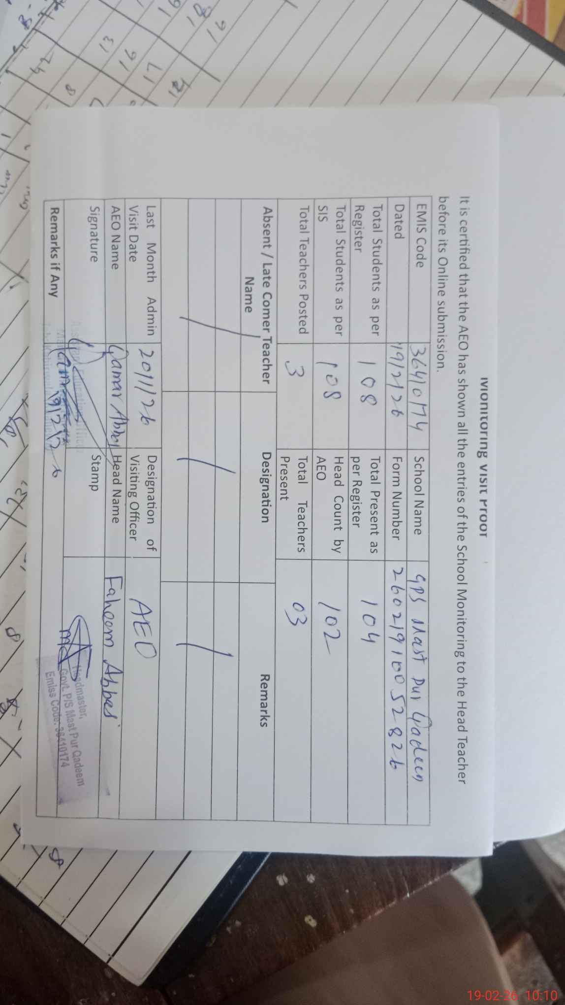 | Certified that this School was Inspected by the Undersigned MEA/DMO Today and the Information Stated Above is as Per Record. | |||||