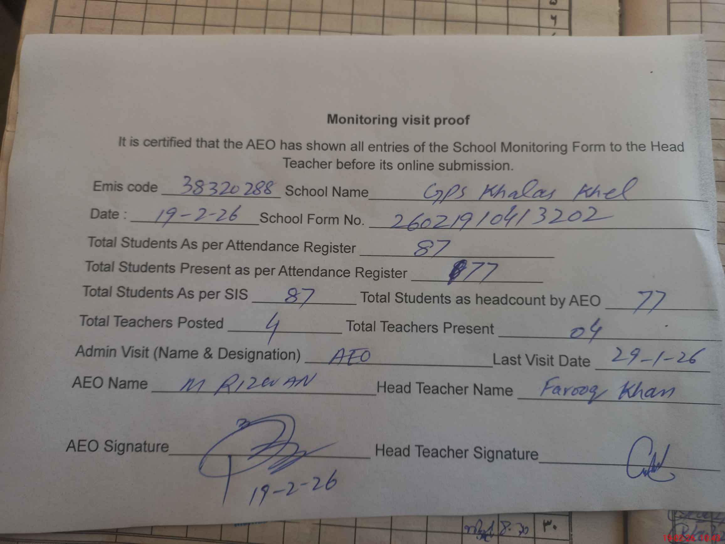 | Attendance Register | Head Teacher | MEA with School | Visit Proof |